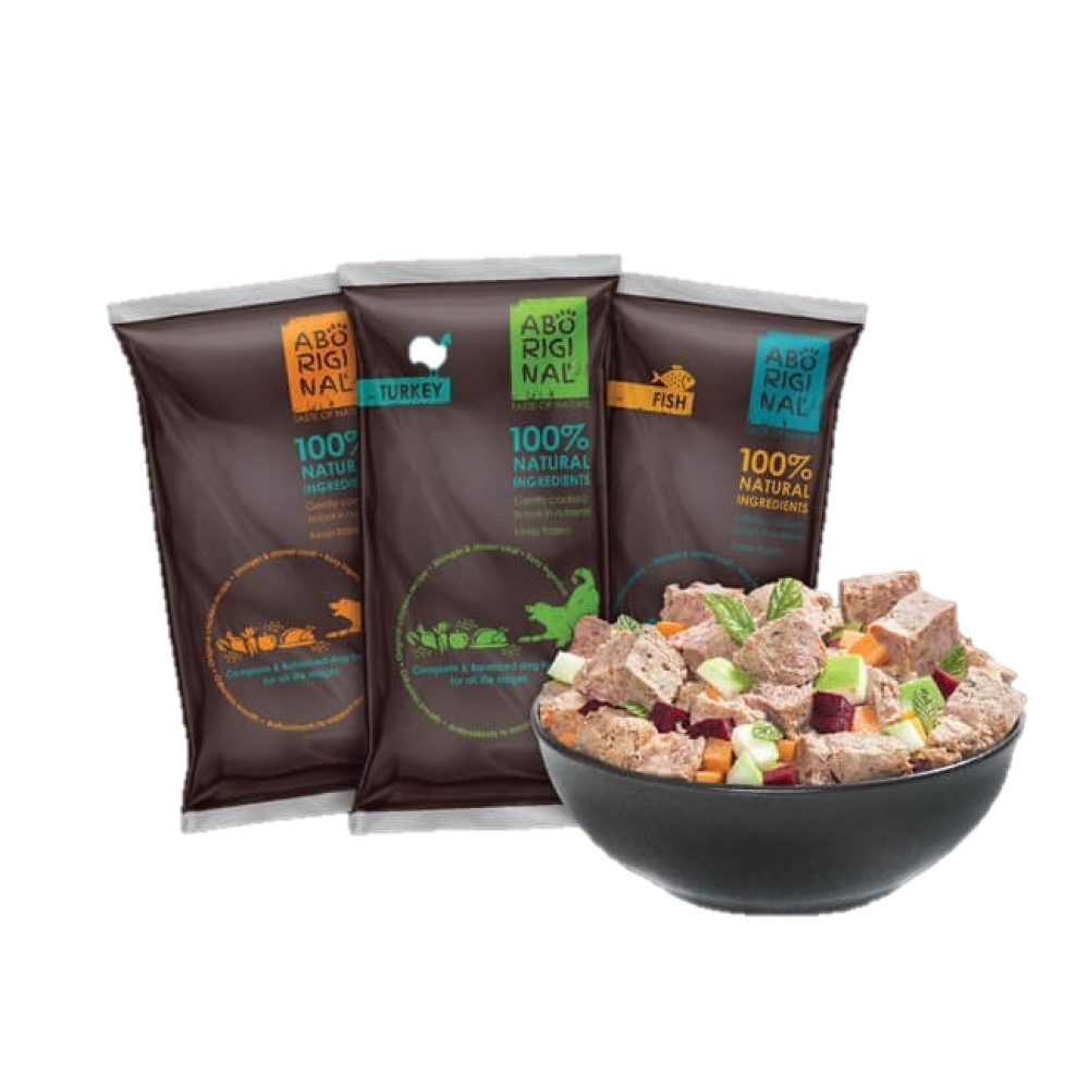 אבוריג'ינל אוכל לכלבים מכיל 80% חלקי עוף\הודו\דגים טריים ו20% פירות וירקות.